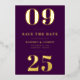 Modern save the date featuring your numeric wedding date in bold gold foil lettering with a dark purple background. Personalise the dark purple and gold foil save the date card by adding your names, wedding date, and wedding location.