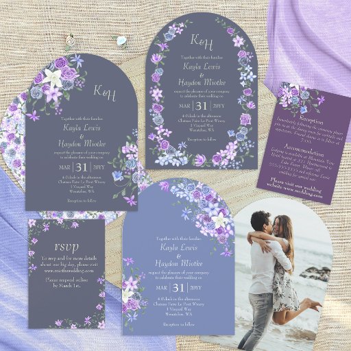 Purple floral wedding invitations are a perfect look for spring or a summer wedding.
