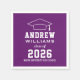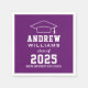 Modern graduation party napkins feature a grad cap with simple and modern white typography design that can be personalised with the graduate's name and school. Purple background can be customised to match any school or party theme colour.