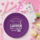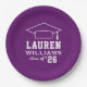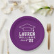 Custom round graduation paper plates features a purple and white design (can be modified via "Customise It!") with a graduation cap and custom text for the grad's name and class year.