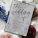 Modern wedding invitation template with elegant hand written style font in purple on a silver metallic background. Also featuring original watercolor artwork of lavender, eucalyputus and purple flowers. Customise the text to create something really unique.