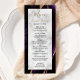 This elegant, modern wedding menu features a watercolor purple agate background trimmed with gold faux glitter. The text appears in elegant gold coloured handwriting and black copperplate font on a grey and white marble rectangle. The agate design is repeated on the reverse.