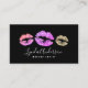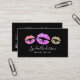 Elegant makeup artist business card design featuring faux pink, purple & gold glitter lips, solid black background and elegant calligraphy font.