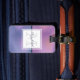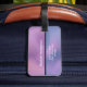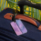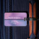 Personalised luggage tag with a modern stylish background. Pink and purple colours swirling around creating an elegant gradient effect.