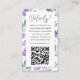 This charming wedding details card showcases elegant text alongside a convenient QR code, set against a rich purple watercolor floral pattern. Easily customise it with your own information for a beautifully personalised touch.