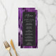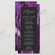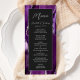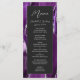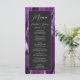 This elegant, modern wedding menu features a watercolor purple agate background trimmed with silver faux glitter. The text appears in elegant silver grey handwriting and sans serif fonts on a dark slate black rectangle. The agate design is repeated on the reverse.