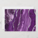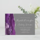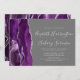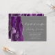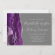 The left-hand edge of this elegant modern wedding invitation features a purple watercolor agate border trimmed with faux silver glitter. The customisable text combines silver grey handwriting, copperplate and italic fonts on a medium grey background. The reverse side features a matching purple and silver agate design.