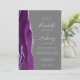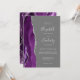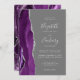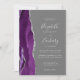 The left-hand edge of this elegant modern wedding invitation features a purple watercolor agate border trimmed with faux silver glitter. The customisable text combines pale silver grey handwriting, copperplate and italic fonts on a medium grey background. The reverse side features a matching purple and silver agate design.