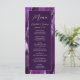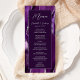 This elegant, modern wedding menu features a watercolor purple agate background trimmed with silver faux glitter. The text appears in elegant silver grey handwriting and sans serif fonts on a plum rectangle. The agate design is repeated on the reverse.