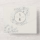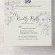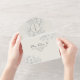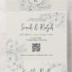 Elegant, modern, unique black and white all-in-one wedding invitation with QR code, monogram with silver floral lace, trendy hand-lettered script and custom picture of the at the back.