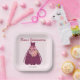 Modern Quinceañera paper party plate features floral and glitter ballgown on pale pink background.