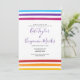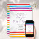 A modern vibrant engagement party invitation featuring colourful rainbow watercolour stripes either side of your wedding details, with the happy couple's names highlighted in an expressive script font. Designed by Thisisnotme©
