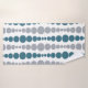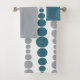 This towel set has a mid-century modern design of teal and grey rounded rectangles in increasing and decreasing size running vertically on a field of white.