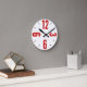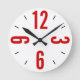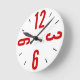 Modern red and black large numbers Round Clock. It displays the numbers 3, 6. 9 and 12 in red in large size and black lines instead of the rest numbers.