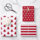 Wrap your gifts with this Modern Red and White Christmas Trees Mixed Wrapping Paper Sheets. This is a minimalist design with a mixture of white background and small dark red tree silhouettes on one sheet. The second sheet has a red background with small white polka dots pattern. The third sheet has red and white stripes.