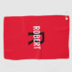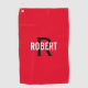 Modern golf towel for him with a black monogram and white name on a red background. Personalise with name and initial.