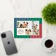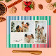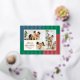 Modern and fresh, this three photo Christmas holiday card is on-trend and luxe with real metallic foil stripes over colour blocks of a denim blue, medium green and washed coral red. The chic design is paired with classically elegant fonts in foil and black. The coordinated backer features plenty of space for a longer custom message update for the year that is perfect for sending to friends and family.