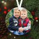 Photo ornament design for the holidays features your favourite image with year text in white (can be customised) with red and black buffalo plaid pattern on the back. Personalise the custom "Merry Christmas" text on the back or remove. Photo tip: crop photo to square format before uploading it to the design template. Photo credit: Two Fish Photography www.twofishphoto.com