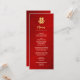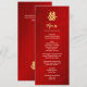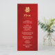 This modern Chinese wedding menu card features an artistic gold double happiness symbol on a shimmering red background. With custom bride and groom names, the wedding date and a custom menu text in a modern handwritten script.