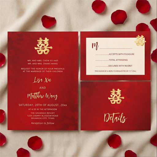 This modern Chinese wedding menu card features an artistic gold double happiness symbol on a shimmering red background. With custom bride and groom names, the wedding date and a custom menu text in a modern handwritten script.