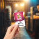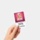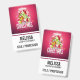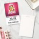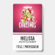 Name badge with a bright and festive Christmas graphic design. The text says Merry Christmas & Happy New Year. Designed with a tree shaped mound of presents with festive snowflakes, stars, christmas baubles and glowy looking sparkles. Pine tree needles and tree shaped illustration also included in this holiday image. The background is a vibrant reddish pink colour.