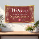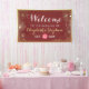 Wedding Welcome Banner Templates - Elegant Gold Lettering Script and Vintage Gold Floral Frame on Red Damask Background.