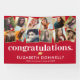 2023 graduation party banner featuring a red background that can be changed to any color, a photo collage of the graduate, the word "congratulations", a faux gold foil mortarboard cap, the graduates name, school, and class year.