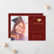 Send your family and friends a unique personalised photo college graduation card to wow them. This template design features your custom photo on the left and to the right a white grad cap sitting on the word "Graduate" written in a hand lettered faux gold script typography. Personalise your class/year, name, degree and other ceremony details on a classic red marroon background. Designed by Susan Coffey.