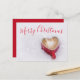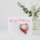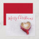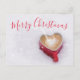 Red Merry Christmas postcard with red script font text on a white background with a lovely cappuccino heart shaped cup in the snow. For a Merry Good Christmas Morning from your family to your loved ones. Similar products in my Miri Creations @Created For You Only Zazzle Store. Enjoy!