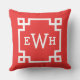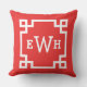 Stylish and modern square accent pillow design features a Greek key geometric border frame design and monogram that can be personalised. Coral orange red and white colours. Background colour can be modified.