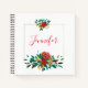 Spiral notebook with a pretty floral bouquet in red, gold and green colours. A gold frame behind the flowers with your personalised name inside.