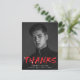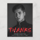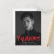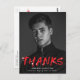 Stylish, modern graduation thank you postcard featuring the graduate's vertical photo with "Thanks" in red lettering with white paint splatters. Personalise the front of the thank you postcard by adding the graduate's name, school name, and graduation year. The back of the graduation thank you postcard features your return address and space for a typed or handwritten thank you message.
