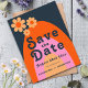 Bold modern groovy retro 70s vintage colours wedding save the date on a dark navy blue background invitation. Three Cool retro minimalist daisies with rainbow arch design in dark navy blue pink mustard yellow and orange apricot tangerine. This fun hippy save the date card is easy to personalise using the simple templates with groovy typography. Ideal for setting the tone for a summer spring or autumn wedding. Original artwork by artist Catherine Sweetman