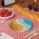 A beautiful 70's inspired colourful retro rainbow abstract waves design. A minimalist wedding plate with groovy patterns and retro colour palette. Matching wedding invitations and other stationery items are also available.