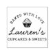 Baked with love cupcake logo stamp for baking business featuring modern retro black and white bakery logo design with personalised business name. Also perfect for wrapping holiday baking gifts.