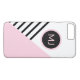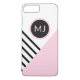 This ultra-stylish contemporary phone case has retro chic appeal with its pop art geometric pattern in angled black stripes and pink colour block with a prominent matching round frame surrounding your monogram. Personalise with your desired monogram for a custom phone case that makes a nice gift or treat for yourself.