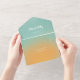 This unique and stylish all in one wedding invitation features a colourful gradient ombré effect in shades of mint green, yellow and orange. This wedding tri-fold invitation is a wedding invitation, enclosure card and RSVP card in one! Customise it with your own wedding information and return address. A super easy way for your wedding guests to send back RSVP cards! The colourful gradient background and minimal typography and text makes this wedding invitation card unique. This wedding invitation template is part of a suite with more wedding stationery including wedding invitations, RSVP cards and more.