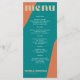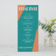Abstract shapes retro vintage 70s style unique wedding menu card with bold typography in a vibrant trendy modern teal, beige tan and orange chic color palette. +++++++ Please note that all the colors are changeable. ++++++++++++ Suitable for informal casual stylish contemporary weddings.