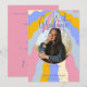 Simple, modern, and elegant, this invitation features the graduate's favourite photo centre stage in a circle at the centre of a lavender purple, rose pink, orange, baby blue and cream retro wave design. The back provides your personalised details on a simple lavender background. Created by Simply Farmhouse Press.