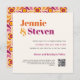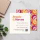 Inspired by the captivating mid-century modern era,drawing upon the intricate geometric floral patterns of that time, the invitation has a harmonious blend of vibrant hues, including purple, pink, orange, and yellow, set against a serene cream background.