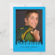 This simple photo graduation invitation features modern retro typography on top of the vertical photo. The background is a bright blue with custom text for the grad's name, year and invitation details on the back side.