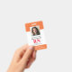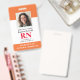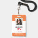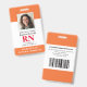 Modern Photo ID RN Registered Nurse Badge. Design featuring of medical orange and white background, single photo, hospital name, profession and name. Personalize with your bar code and contact details. Modern ID badges make it simple for customers and clients to identify employees. To edit this template click customize further.