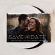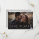 A modern save the date card displaying your favourite engagement photo with "Save the Date" in a simple white font overlay complimented by elegant calligraphy script. Personalise the front of the photo save the date card by adding your names, wedding date, and wedding location. The card reverses to a grey background with a white modern pattern. Change the colour of the background to a colour of your choice with our editing tools.