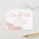 Announce your upcoming wedding with this modern rose gold tropical palm leaf save the date postcard, with trendy script typography.