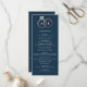 Clean and modern text is easily personalised on this chic, skinny format, wedding program. White type feels sophisticated and feminine when accented with a faux rose gold foil graphic of interlocked wedding rings on a background of navy blue.