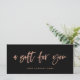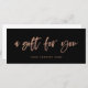 This modern small business gift certificate features faux rose gold trendy casual script typography that says "a gift for you," on a dark black background.