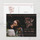 Chic and simple wedding save the date postcard featuring a faux rose gold foil border and hand-written script text overlay.