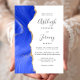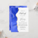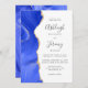The left-hand edge of this elegant modern wedding invitation features a royal blue watercolor agate border trimmed with faux gold glitter. The customisable text combines handwriting, copperplate and italic fonts in charcoal grey on a white background. The reverse side features a matching royal blue and gold agate design.