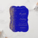 The left-hand edge of this elegant modern wedding invitation in trendy bracket shape features a gold faux glitter design. The customisable text combines pale gold-coloured handwriting, copperplate and italic fonts on a royal blue background. The reverse side features a matching royal blue and gold glitter design.