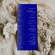 The left-hand edge of this elegant modern wedding program features a silver faux glitter design. The customisable text combines white handwriting, copperplate and italic fonts on a royal blue background.